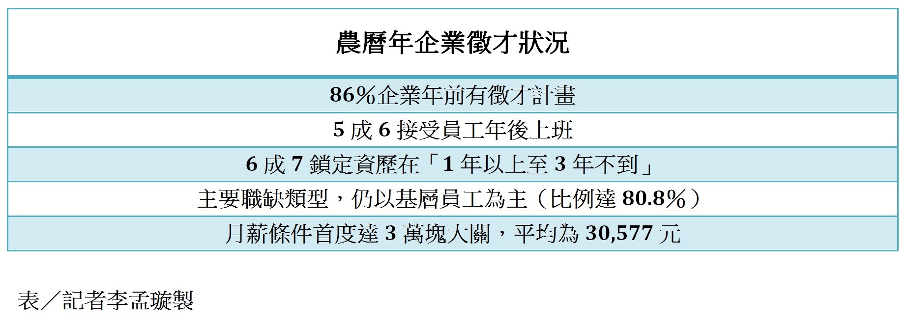 | 86%企業年前有徵才計畫 5成6接受員工年後上班 15 Dec 10:29 AM ▲86%企業年前有徵才計畫,5成6可以接受新進員工在年後上工。(圖/達志影像) 記者李孟璇/台北報導 景氣冷颼颼,不少人擔心轉職沒機會,但有調查指出,有86.7%的企業表示,在猴年農曆年前有徵才計畫,且有5成6